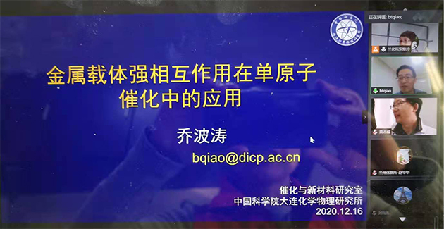 12月16日,應(yīng)羰基合成與選擇氧化國(guó)家重點(diǎn)實(shí)驗(yàn)室邀請(qǐng),中國(guó)科學(xué)院大連化學(xué)物理研究所喬波濤研究員與中國(guó)科學(xué)院蘭州化學(xué)物理研究所進(jìn)行線上學(xué)術(shù)交流,并作了題為“金屬載體強(qiáng)相互作用在單原子催化中的應(yīng)用”的學(xué)術(shù)報(bào)告。
