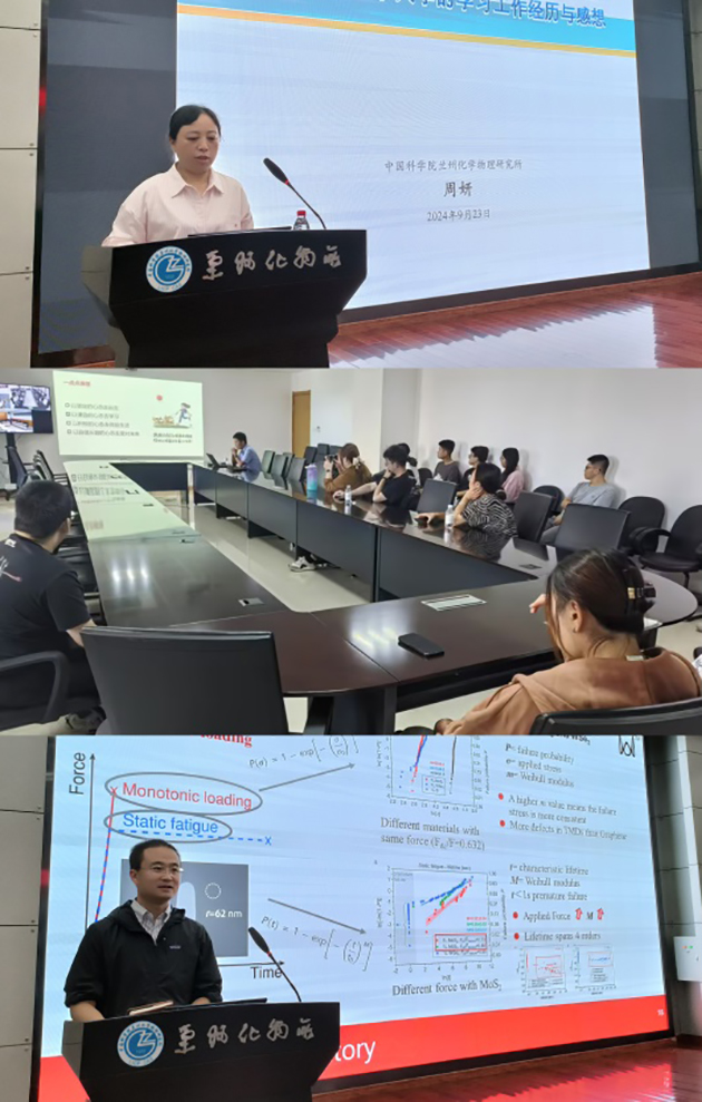 2019年度中國科學(xué)院公派留學(xué)訪學(xué)項(xiàng)目獲得者、蘭州潤滑材料與技術(shù)創(chuàng)新中心周妍博士和王超博士,2022年度科技部青年科技人才中長期出國(境)培訓(xùn)項(xiàng)目獲批人、潤滑材料重點(diǎn)實(shí)驗(yàn)室嚴(yán)云峰博士分別圍繞摩擦誘導(dǎo)界面結(jié)構(gòu)對稱破缺機(jī)理研究,熒光成像原位研究潤滑油在多孔含油材料及摩擦界面處的流動與分布機(jī)制研究,單層MXene的制備、破壞力和疲勞的研究及取得的成果進(jìn)行了報(bào)告,介紹了國外學(xué)校、合作者及所在團(tuán)隊(duì)的概況,分享了國外實(shí)驗(yàn)室和團(tuán)隊(duì)的先進(jìn)管理經(jīng)驗(yàn)、良好的工作習(xí)慣、外方機(jī)構(gòu)選擇、項(xiàng)目申報(bào)中的注意事項(xiàng)以及在外期間面對的困難挑戰(zhàn)和學(xué)習(xí)生活趣事等。