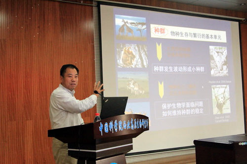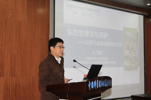 本次論壇共安排11個(gè)特邀報(bào)告。中國科學(xué)院院士、中國科學(xué)院水生生物研究所研究員桂建芳,中國科學(xué)院動(dòng)物研究所研究員蔣志剛、王德華、雷富民、杜衛(wèi)國、詹祥江,西北大學(xué)教授李保國、中國科學(xué)院昆明動(dòng)物研究所研究員施鵬、東北林業(yè)大學(xué)教授張明海、山東大學(xué)教授李玉春、西北高原所研究員楊其恩分別作了題為“多倍體銀鯽及其復(fù)合種的生態(tài)分布格局與演化歷史”、“未雨綢繆、亡羊補(bǔ)牢:量化中國哺乳動(dòng)物滅絕風(fēng)險(xiǎn)”、“生理生態(tài)學(xué)與動(dòng)物保護(hù):學(xué)科地位與發(fā)展的思考”、“應(yīng)對(duì)第四紀(jì)冰期和氣溫變化的鳥類譜系地理學(xué)過程”、“生態(tài)生理學(xué)與保護(hù):以爬行動(dòng)物溫度響應(yīng)為例”、“Reference genome, population genetics and population genomics of wild falcons”、“環(huán)境變化下的秦嶺金絲猴社群結(jié)構(gòu)”、“基因組時(shí)代下的生物多樣性資源挖掘”、“基于糞便分子生物學(xué)及3S技術(shù)的馬鹿家域研究”、“我國小型哺乳動(dòng)物物種多樣性的低估與保護(hù)迫切性”和“配子體外生產(chǎn)技術(shù)在畜牧生產(chǎn)和野生動(dòng)物保護(hù)中的應(yīng)用潛力和挑戰(zhàn)”的報(bào)告。精彩絕倫的報(bào)告引起了與會(huì)代表的極大興趣,大家認(rèn)真傾聽、踴躍發(fā)言,展開了熱烈的交流與討論,現(xiàn)場(chǎng)氣氛異常活躍。