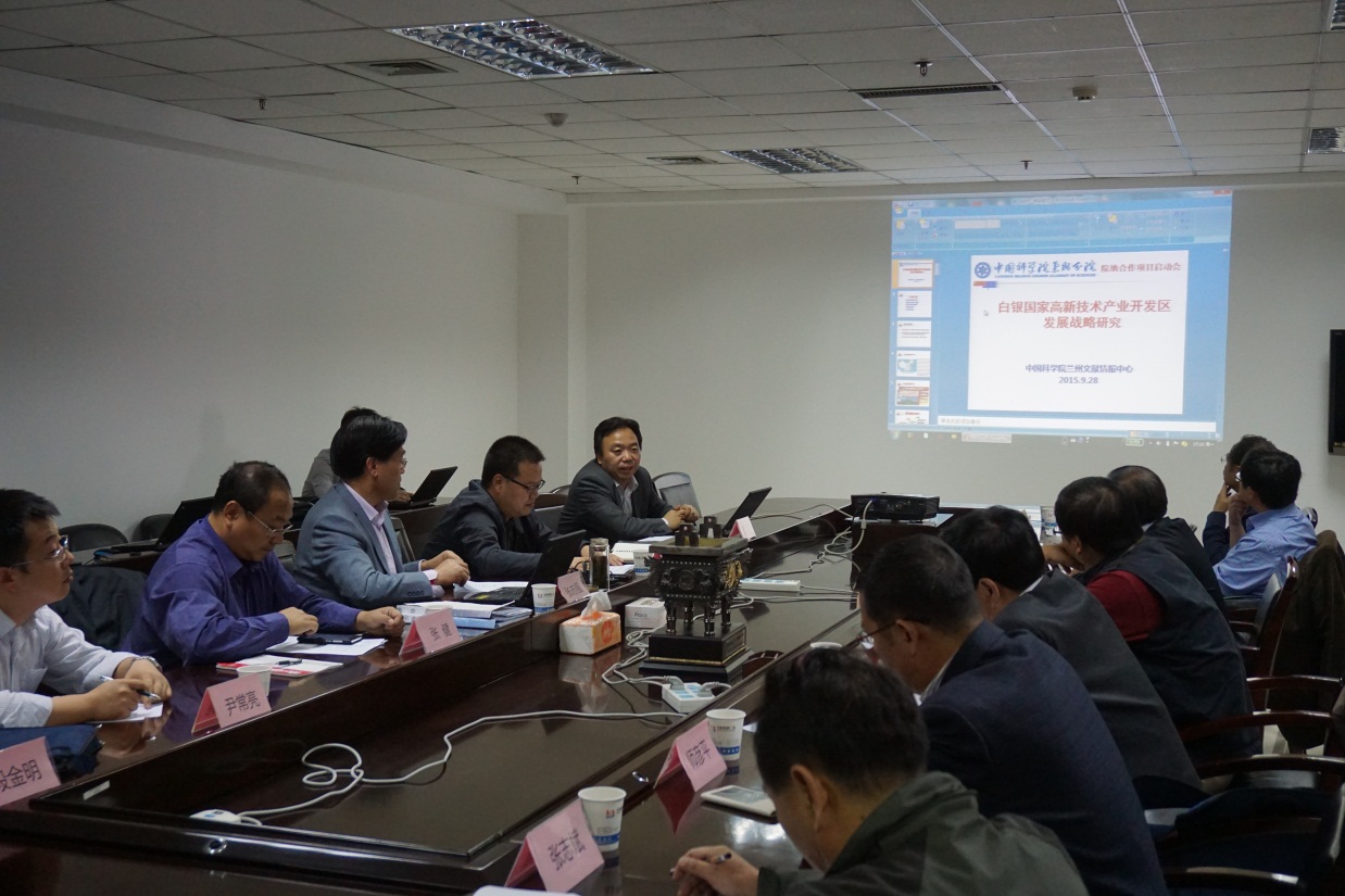 9月28日,“白銀國家高新技術(shù)開發(fā)區(qū)創(chuàng)新發(fā)展戰(zhàn)略研究”項目啟動會在中國科學(xué)院蘭州文獻(xiàn)情報中心召開,來自甘肅省政府研究室、中科院蘭州分院、中科院近代物理研究所、中科院蘭州化學(xué)物理研究所、西北師范大學(xué)、白銀國家高新技術(shù)開發(fā)區(qū)等單位的十位專家對項目研究方案進(jìn)行了深入咨詢。會議由蘭州文獻(xiàn)情報中心主任張志強研究員主持,中國科學(xué)院蘭州分院副院長楊青春、院長助理張健以及院地科技合作處負(fù)責(zé)人等參加了會議。