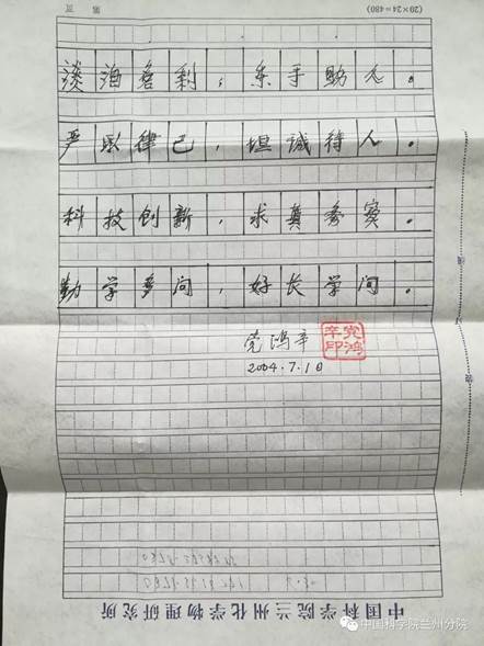 2004年7月10日,黨鴻辛躺在醫(yī)院病床上,在標(biāo)識(shí)有“中國科學(xué)院蘭州化學(xué)物理研究所”字樣的一張稿紙上寫下遺訓(xùn):