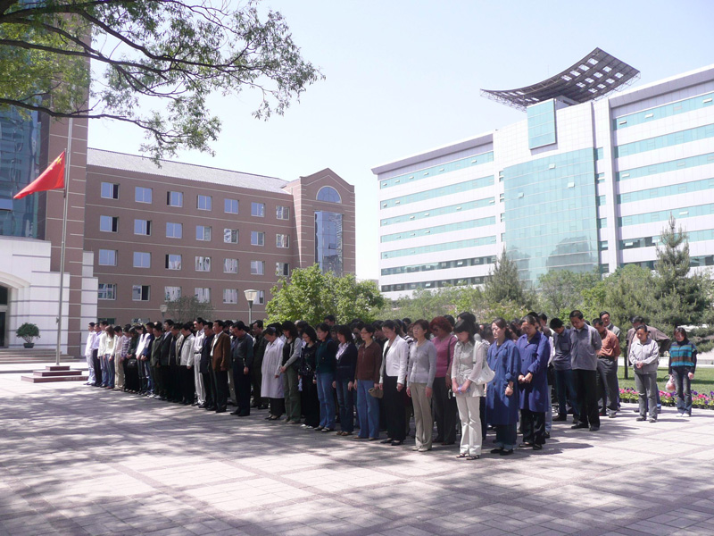 5月19日下午14時(shí)28分,隨著防空警報(bào)在城市上空的鳴響,我所參加默哀活動(dòng)的全體人員,在半降的國(guó)旗下,面向南方默哀3分鐘,沉痛悼念四川汶川大地震遇難者。 為表達(dá)全國(guó)各族人民對(duì)四川汶川大地震遇難同胞的深切哀悼,國(guó)務(wù)院18日發(fā)布公告,決定2008年5月19日至21日為全國(guó)哀悼日。5月19日下午14時(shí)28分,中國(guó)全國(guó)人民為四川汶川大地震遇難者默哀3分鐘,汽車、火車、艦船鳴笛,防空警報(bào)鳴響。 全國(guó)各地的人們用同一種方式和災(zāi)區(qū)人民心連心,在舉國(guó)同悲的時(shí)刻,讓我們祝愿地震中的遇難者安息,全國(guó)人民將齊心協(xié)力和災(zāi)區(qū)的人民一起抗震救災(zāi),幫助他們?cè)缛罩亟覉@。